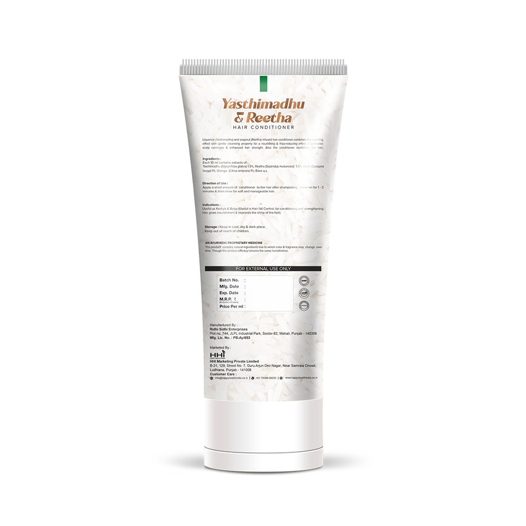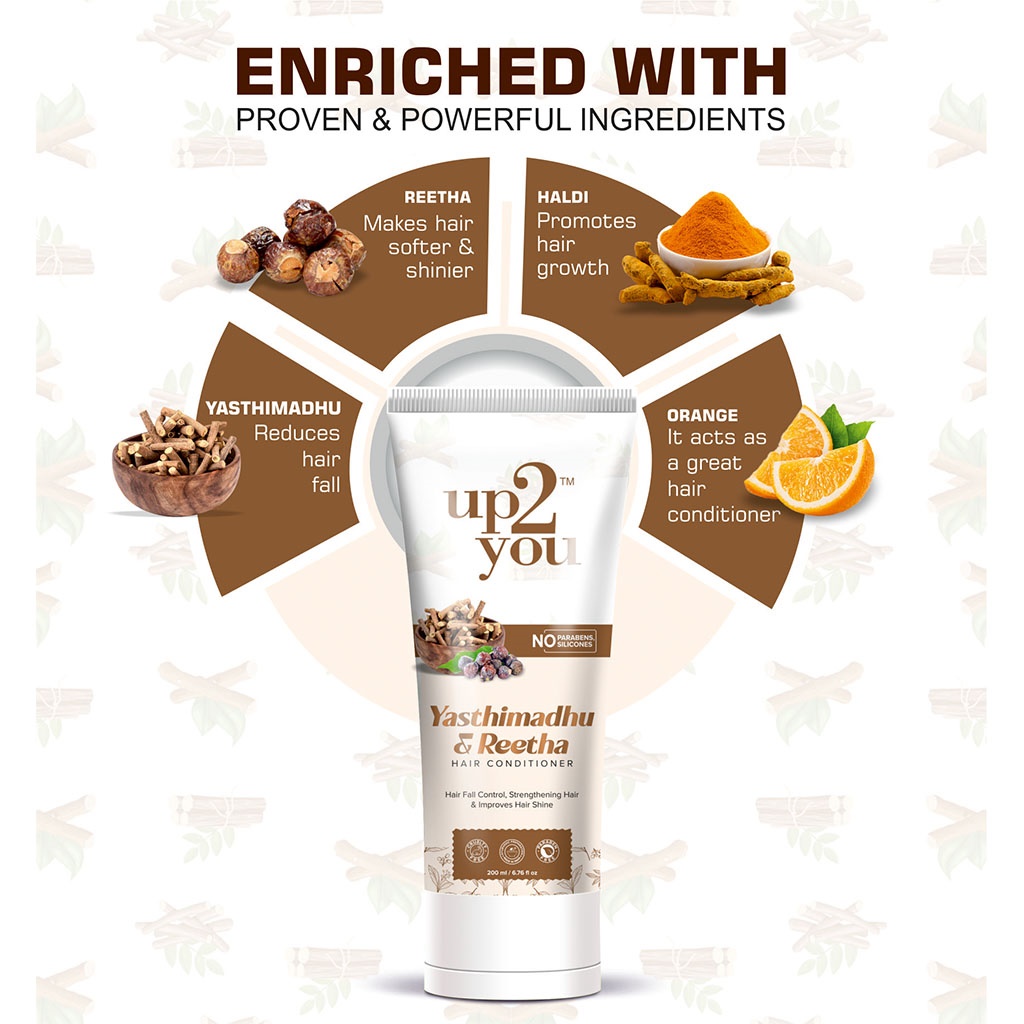 Up2You Yasthimadhu & Reetha Hair Conditioner by Happy Health India is formulated with herbal ingredients such as yasthimadhu, reetha, haldi, and orange extracts. This conditioning formula helps moisturize and smooth the hair strands while supporting softness, shine, and manageability. Regular use after shampooing helps keep hair feeling soft, refreshed, and easy to style as part of your daily hair care routine.