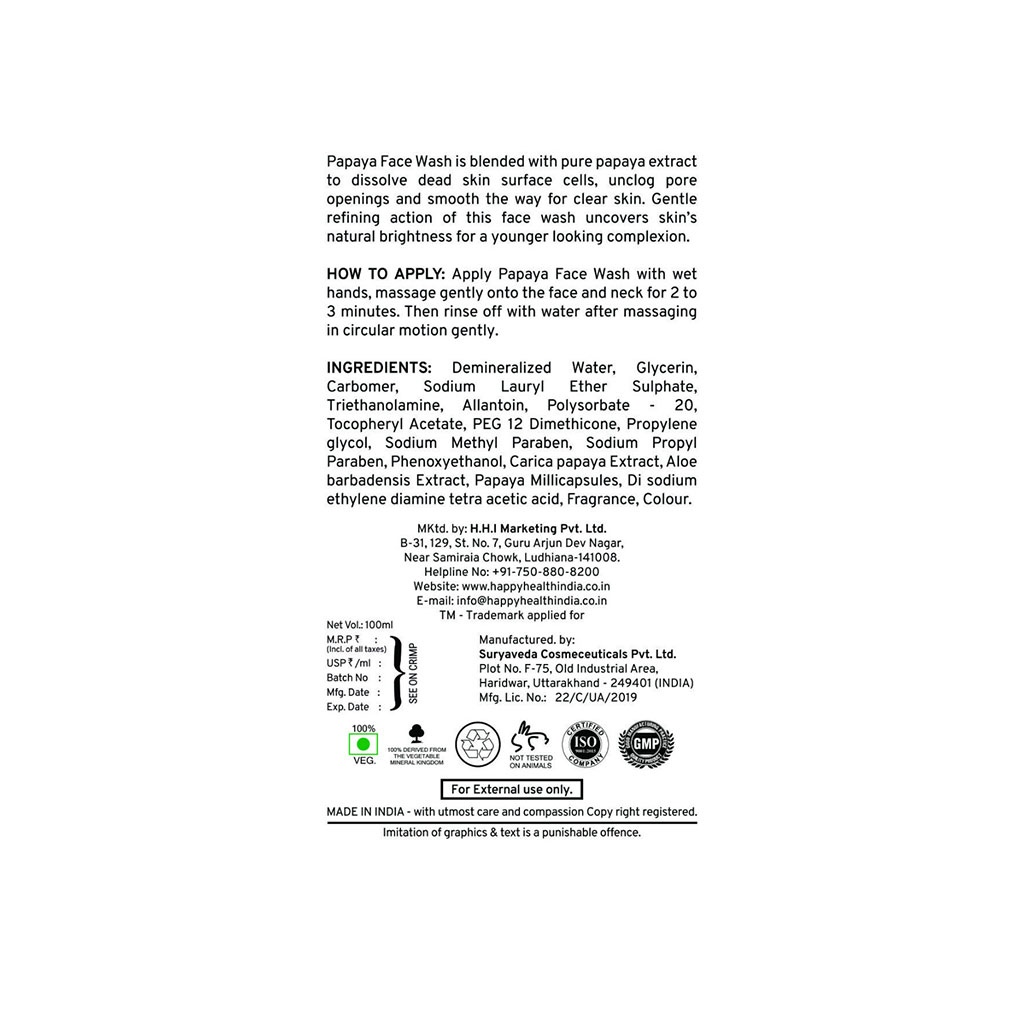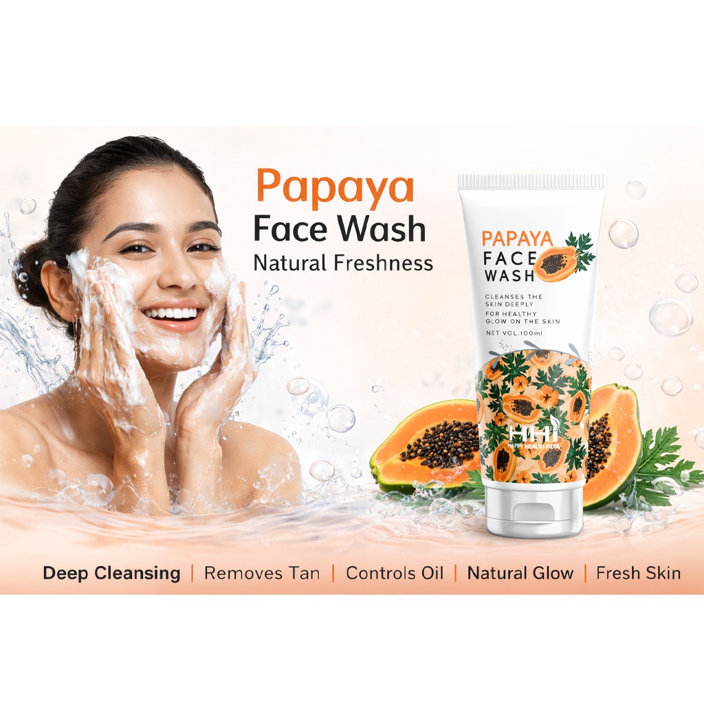 HHI Papaya Face Wash by Happy Health India is formulated to provide a refreshing facial cleansing experience. Enriched with papaya-inspired ingredients, it helps remove dirt, excess oil, and daily impurities from the skin surface. The mild formulation supports a clean, smooth, and fresh-looking complexion when used regularly as part of a daily skincare routine.
